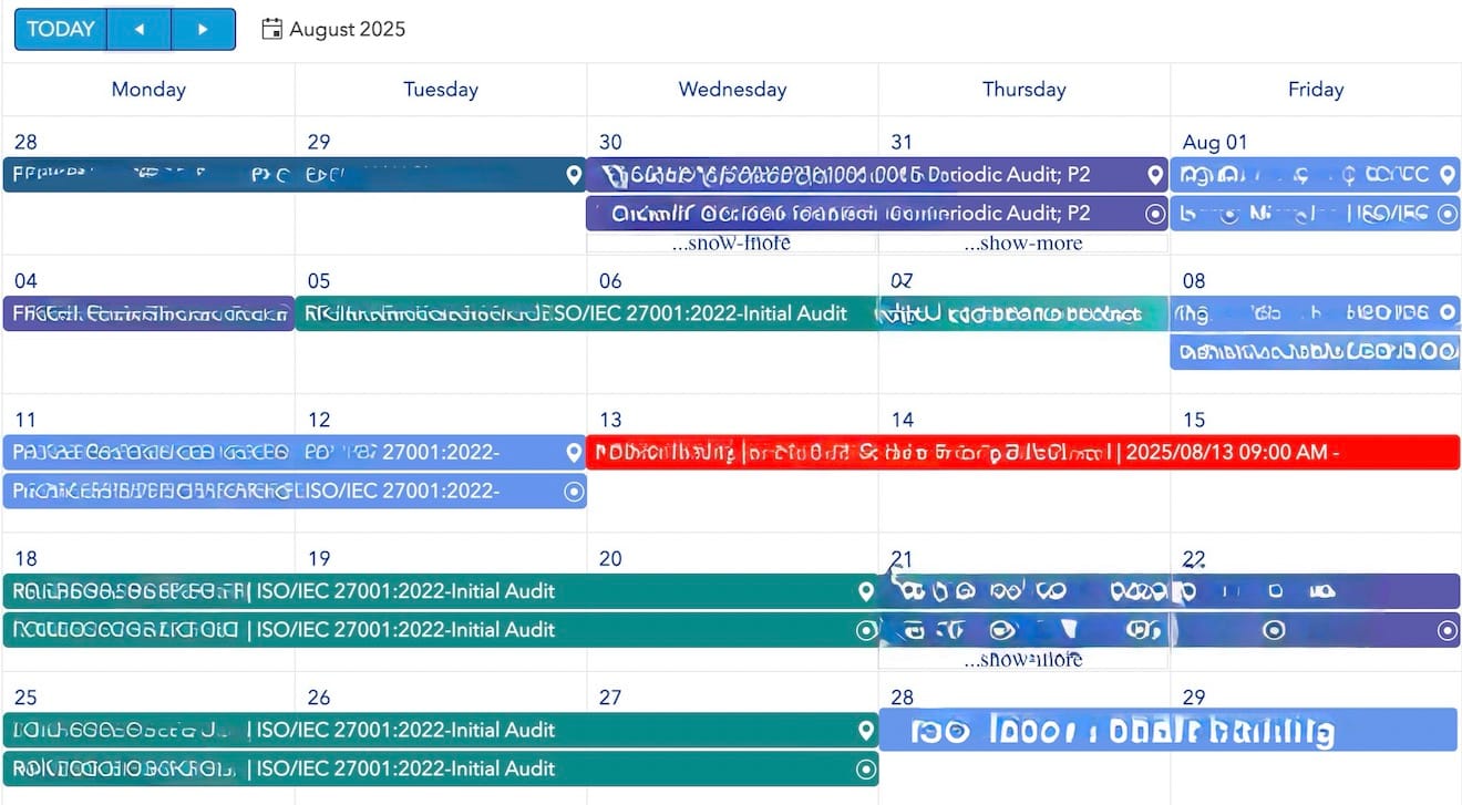 This is my audit schedule for August. Some bars are doubled, and some audits were overlapping with others. After each audit, if you are a lead auditor for a global multisite company, you have to do a lot of work creating and uploading documentation. It is paid time, and it is okay, but only if you have some kind of gap between audits. In this schedule, you are doing that in your own time.