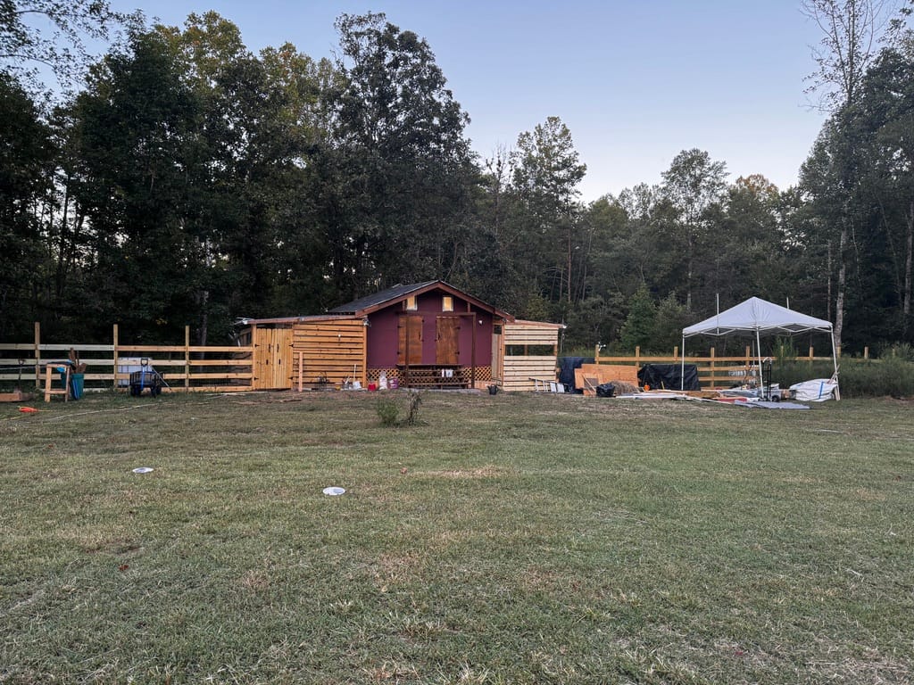 Progress on the new coop looked like this, and only by September 5th was I able to finish the fence, move the goats, and clear everything up. The cleaning part is the most annoying and time-consuming task, and I genuinely hate it. Also, no one does it except me (complaining!). Every time I need to work on something (like a fence), I have to clean up after previous processes—and most often not after my own work, but after someone else’s. If I have only two hours in a day, one hour and forty-five minutes can be spent just sorting dumped stuff and getting angry with every passing minute.