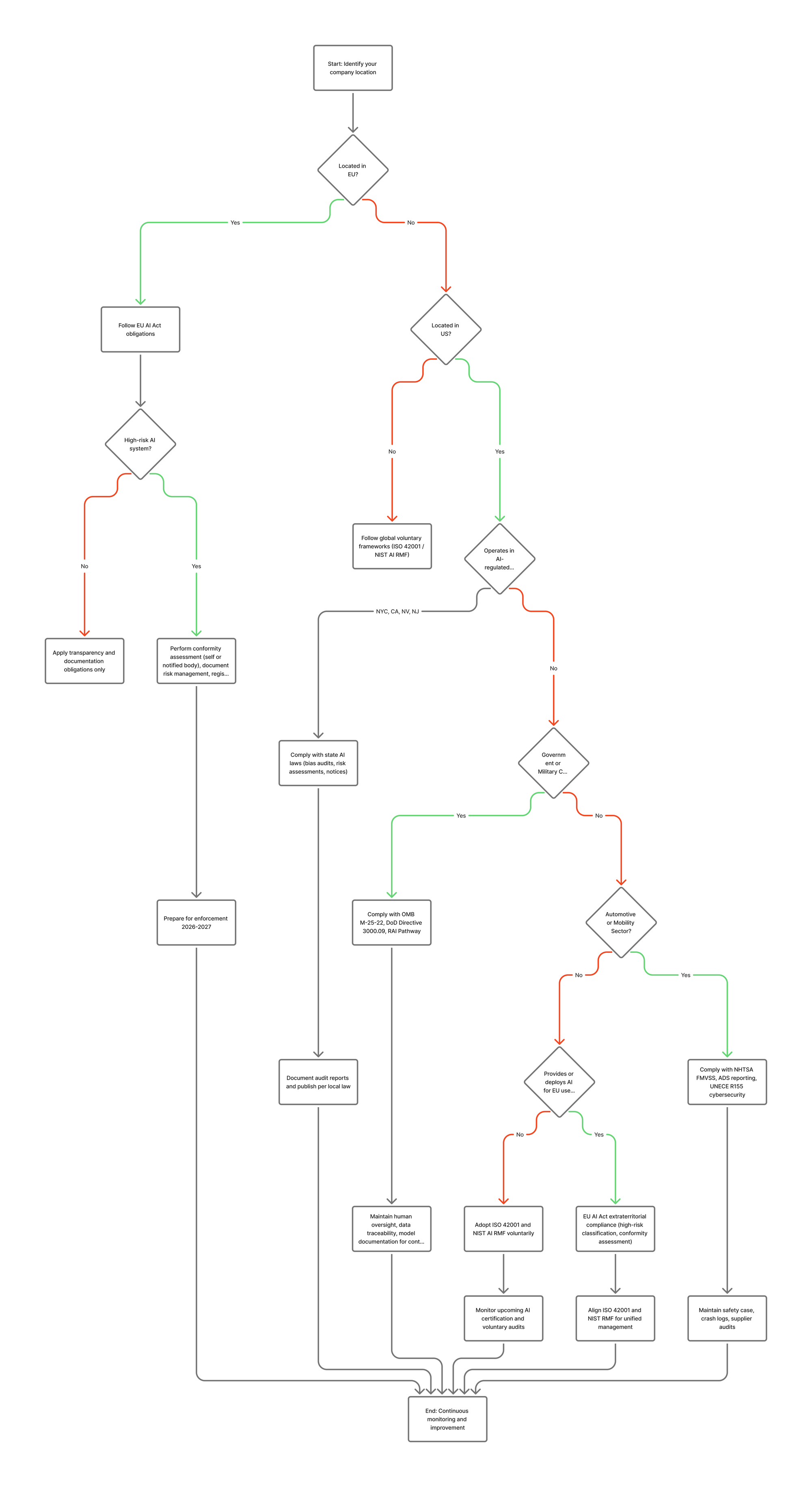 - Implement ISO 42001 (AI Management System) for an auditable layer of governance—this is the bridge between voluntary and mandatory.
